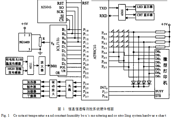 AT 89C系列單片機共 4個接口 ( P0、 P1、 P2、 P3 )32位 ,本系統所需的接口如下: 4× 4鍵盤占 8位; A /D轉換器 7135需 12位; 微型打印機 10位; 監視器 CRT(串口 ) 2位; 12位數碼顯示器 LED 需 20位 I / O 口 (用并行口 , 12位 , 8段 ); 輸出控制位 4位; 2 個控制二選一轉換開關 4066需 2位; 中斷 2位; X25045需 4位 ,故共需 64位 I /O 口。如擴展 I /O 口 則將使系統變得既龐大、又雜復。本文使用單片機接口的復用技術 ,可以使系統大大簡化。在復用技術中應遵循兩條原則: 除了輸出控制位之外 ,其它 I /O 口位都可以使用復用技術; 充分利用單片機接口各位 ,只有到單片機本身接口不夠使用時才使用接口復用技術。 1. 1. 1 CRT 監視器與 LED顯示器共用串口 如果不用接口復用技術 ,單片機與 PC機的通訊用了串口 ( 2位 ) , LED顯示就只能用并口動態顯示 ( 10+ 8= 18位 ) ,總共需 20位。本系統 LED 顯示采用通過串入并出接口 74LS164實現靜態顯示。如圖 1所示 ,只要用單片機的 1位作二選一開關 4066 的控制位 ,亦即只用單片機的 3位 ,就達到了使兩種顯示器共用串口的目的。 這樣既節省了 I /O 口 ,也節省了為 LED動態顯示 CPU 所花費的時間。 1. 1. 2 鍵盤與微型打印機共用 P0 口 鍵盤輸入接口與微型打印機輸出接口共用 P0 口 , 鍵盤再用到中斷口 IN T0 , 微型打印機再用到 W R、 RD信號位即可使兩者互不影響。 1. 1. 3 2045與 ICL 7135共用 P1 口 本系統所采用的 A /D 轉換器如圖 1所示的 ICL 7135是四位半雙積分 A /D轉換器。 它具有抗干擾性能好 ,轉換精度高 (相當于 14位二進制數 ) , 自動校零 ,動態字位掃描 BCD碼輸出 ,單基準電壓 , 價格低廉等特點。雖然它的轉換速度較慢 ,但本系統所控的對象—— 溫濕度變化都是緩慢的量 ,是足夠的了[2 ]。 它占用 P1 口 8位 , P2 口 4位。 X25045芯片把 3種常用功能—— 看門口定時器、電壓監視和 E2 PROM 組合在單個封裝之內 ,這種組合降低了系統成本并減少了對電路板空間的要求。 其中 4096位串行 E2 PROM 是按 512× 8組織的 ,是提高系統可靠性及自動化標定與校準的硬件 基礎[4 ]。 ICL7135與 X 25045是分時與 CPU 聯系的 ,二 者復用 P1 接口。 前者雖然是連續工作 ,但取數卻是程序控制。 X25045的工作有嚴格的時序 ,理論分析與工作實踐都證明 , IC L7135的連續工作不會影響 X 25045的工作。 1. 2 信號處理通道設計 測控系統檢測精度的高低在很大程度上取決于信號處理通道的設計質量。 1. 2. 1 傳感器 本系統采用了穩定性、重復性和線性度都較好的鉑電阻 Pt100溫度傳感器和 HS20型 (日本 )濕度傳感器。高精度傳感器是提高檢測精度的重要保證。 1. 2. 2 通過采樣參考值以消除系統漂移 通過多路模擬開關 ,兩個傳感器和參考電阻的信號處理共用一個多路開關 4051放大電路和 A / D 轉換電路 ,通過對參考電阻的采樣與處理 ,既簡化了系統 ,又基本消除了系統的漂移 ,從而提高了檢測精度。 2 系統軟件設計 整個恒溫恒濕箱控制系統是在應用程序的控制下執行的 ,應用程序由主程序、數據巡回采集及處理子程序、 PID 調節子程序、鍵盤中斷服務程序、打印子程序及定時中斷服務程序等組成。 2. 1 主程序主程序流程圖