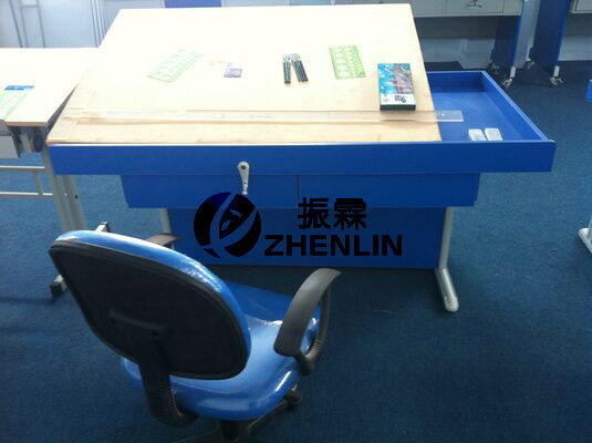 建筑工程制圖室是建筑類專業(yè)的專業(yè)基礎(chǔ)實(shí)驗(yàn)室,主要用于學(xué)生完成建筑識(shí)圖、手工繪圖等教學(xué)任務(wù),旨在培養(yǎng)學(xué)生掌握建筑圖紙的識(shí)圖技巧和手工繪圖的繪圖方法,加強(qiáng)學(xué)生應(yīng)用新技術(shù)、新方法的訓(xùn)練,提高學(xué)生發(fā)現(xiàn)問(wèn)題、分析問(wèn)題和解決問(wèn)題的能力。其中學(xué)生繪圖桌經(jīng)過(guò)多年的改進(jìn),現(xiàn)具有實(shí)用方便,配備齊全,輕巧大方,堅(jiān)固耐用、拆裝方便等特點(diǎn)。桌子右面可入置儀器、工具,下面抽屜供學(xué)習(xí)資料、工具書(shū)等。