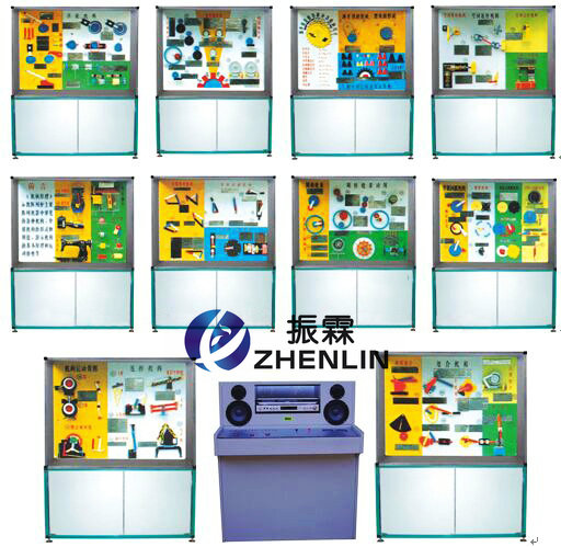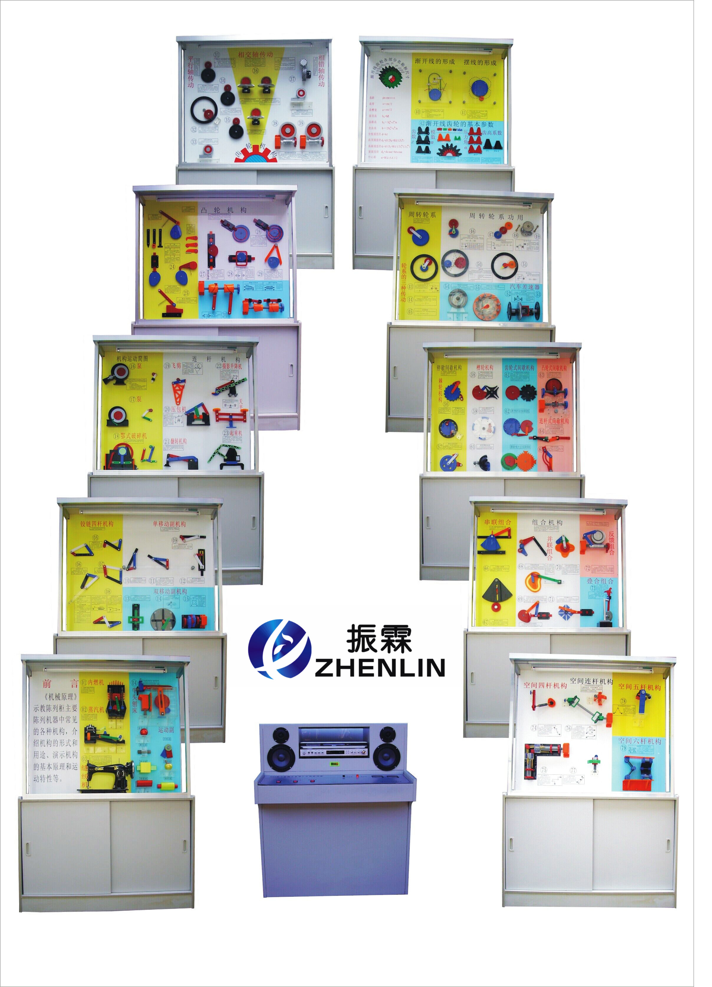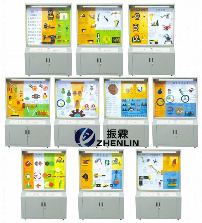 機械原理陳列柜是根據(jù)大、中專院校、技校、職業(yè)學校的機械原理教學大綱而設計的一套電化教學設備?!稒C械原理》課程是工科院校機械類、近機械類專業(yè)的一門重要技術基礎課程。陳列柜共分十個柜和一個在DVD控制臺,進行聲控同步解說演示。由單片機控制順序或任選運行每個柜模型動作。