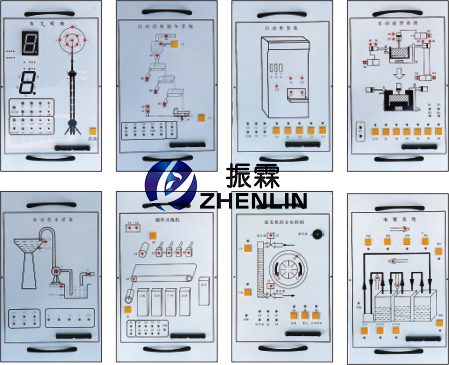 演示裝置上對(duì)PLC的輸入輸出均采用24V電源,5V電源供執(zhí)行機(jī)構(gòu)中的外圍使用,每套演示裝置主要由十七塊實(shí)驗(yàn)掛箱組成,它們的型號(hào)分別為: