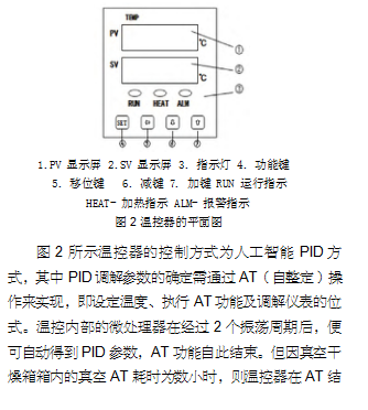 溫度失控在真空干燥箱使用中尤其常見,其表現形式有二:一是直接在接通電源和設定溫度后加溫,建議用萬用表來檢查真空干燥箱是否存在可控硅短路,如若可控硅短路受損,則可用同一型號的可控硅進行替代修復;二是在接通電源和設定溫度后,即使按下“開始”按鍵,真空干燥箱也不升溫,建議用萬用表來檢查其可控硅或熱電偶是否損壞,如若受損,則用同一型號的器件來進行替代修復。一旦排除真空干燥箱溫度失控的原因不是上述所言,則可確定其溫控電路存在故障。針對這一問題,為了減少資金投入,建議選用G產優質的溫控器,同時注意如下事項:一是不得隨意變動箱體的加熱電路結構布局和傳感器溫度檢測部位;二是確認溫控器電參數的匹配程度,以保證其負載能力、控溫范圍和精度與要求相符;三是盡量少改動溫控器與傳感器的幾何形狀和外型尺寸,建議采取如下方法:shou先,拆除與新裝溫控器不相干的器件,如前面板;其次,通過在前面板處開孔來固定新溫控器和傳感器探頭,并將傳感器的引線接在溫控器后側的接線端子上;**后,分別將箱體加熱爐絲的兩端用粗徑導線連在固態繼電器端子上和電源的一端上進行調機。針對真空干燥箱溫控器的調機,以圖 2 所示溫控器為例展開討論。