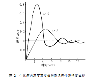 3) 的一段時間內, 機內溫度仍繼續下降, 然后才逐漸上升;而在調節器斷開加熱器停止加熱(t2)后的一段時間內, 機內溫度仍將繼續上升, 然后才下降。 因此, 生化培養箱溫度的實際波動范圍將超出設定的溫度控制范圍 (2ε)。 熱傳遞延時 τ的存在將使溫度波動范圍加大, τ越大, 上述影響越大。