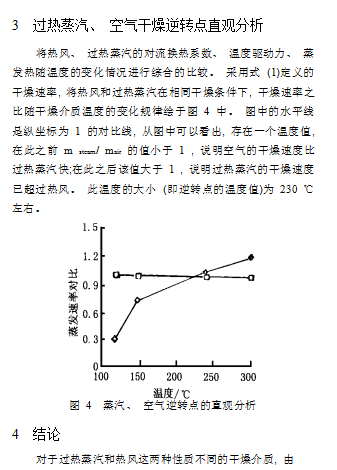 于其基本熱力學特性的不同, 在不同的蒸發溫度下會反映出不同的蒸發速率變化規律。 考慮恒速干燥段, 在較低的介質溫度下, 熱風干燥時物料表面溫度和介質的溫度差比過熱蒸汽大許多, 使得在較低溫度時 , 熱風的干燥速度比過熱蒸汽要快;隨著溫度的升高, 這種溫差大所占比例優勢明顯下降;過熱蒸汽的對流換熱系數隨溫度的升高較熱風增長得要快, 抵償了溫差小的劣勢 ;而蒸發單位水分需用的熱量, 過熱蒸汽比同樣條件下的熱風所需的熱量要小。正是這三方面的結合使得逆轉點存在。